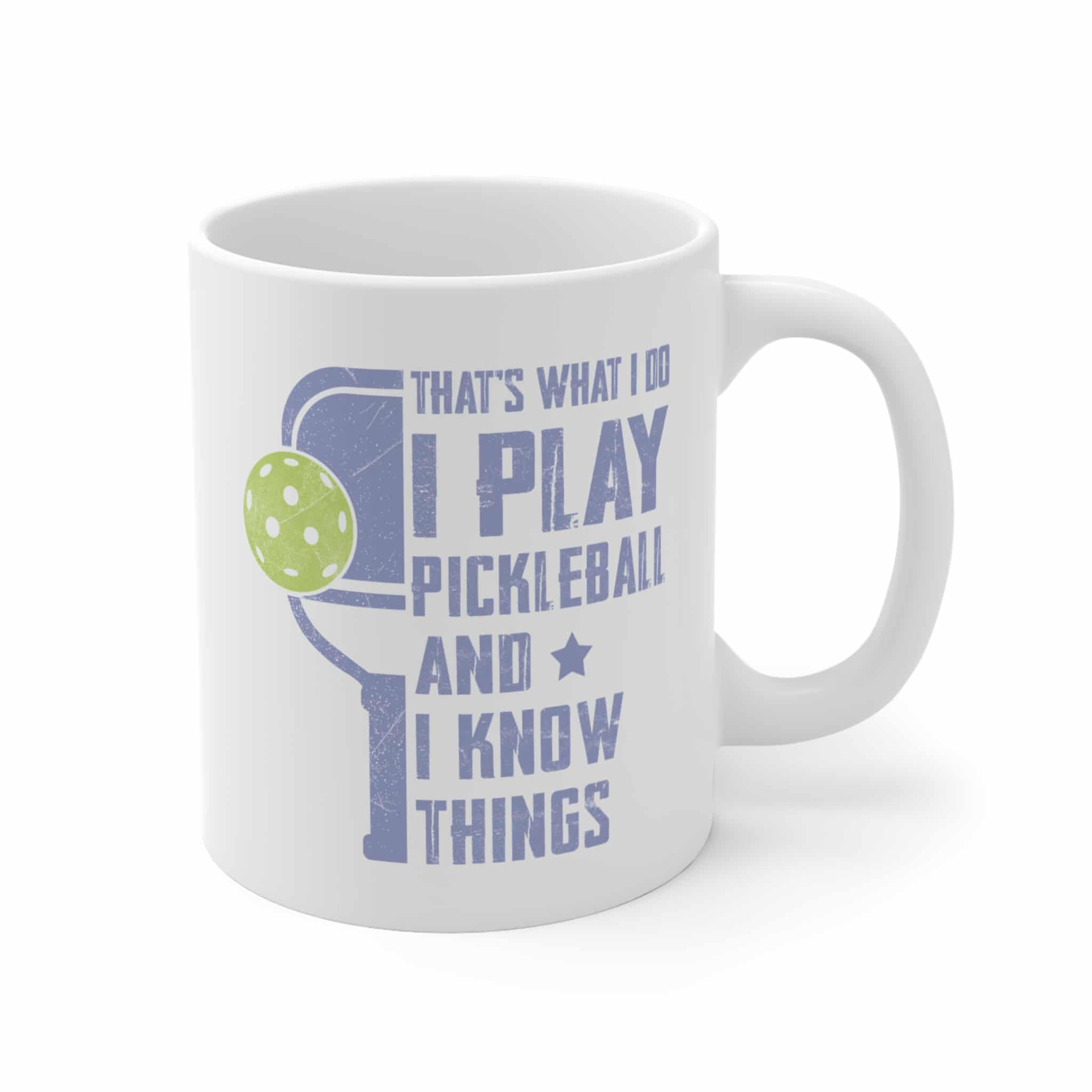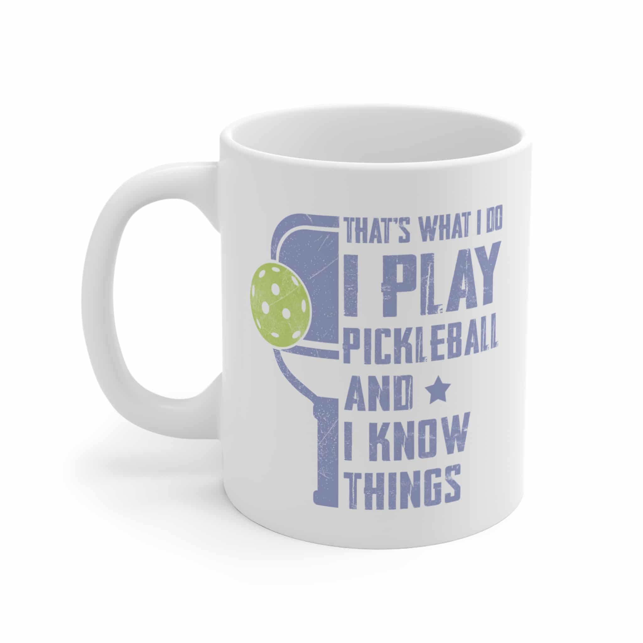 “That’s What I Do. I Play Pickleball and I Know Things” Funny Pickleball Mug – White Ceramic, 11oz